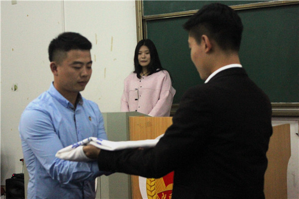 第十五届学生会主席尤硕代表卸任学生干部发言,他总结回顾了三年来的工作经历,表达了对指导老师和工作伙伴们的感谢,并寄语新一届学生会,希望他们积极行动、团结一致、开拓创新。随后,尤硕向新一届学生会主席庙冬冬移交了学生会会旗,带领第十六届学生会全体成员进行庄严宣誓。