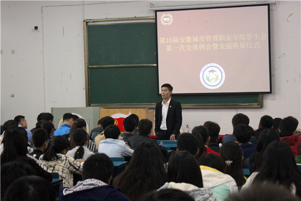 11月4日中午,我院第十六届学生会第一次全体例会暨全面换届仪式在3115教室隆重举行。院团委书记王放、副书记张在晨及相关负责教师出席。院学生会全体成员参加会议。