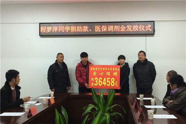 12月28日下午,在学院第一会议室举行了患病学生程梦萍同学的捐助款、医保调剂金发放仪式,将3.6458万元捐助款、9.306万元大学生医保省级调剂金交予学生家长。纪委书记陈力、学生处负责人、国际商务系负责人及相关工作人员参加了发放仪式。