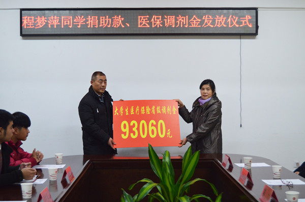 (学生处处长郑晓春将大学生医疗保险省级调剂金交予程梦萍父亲)