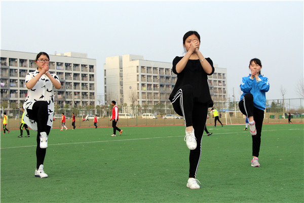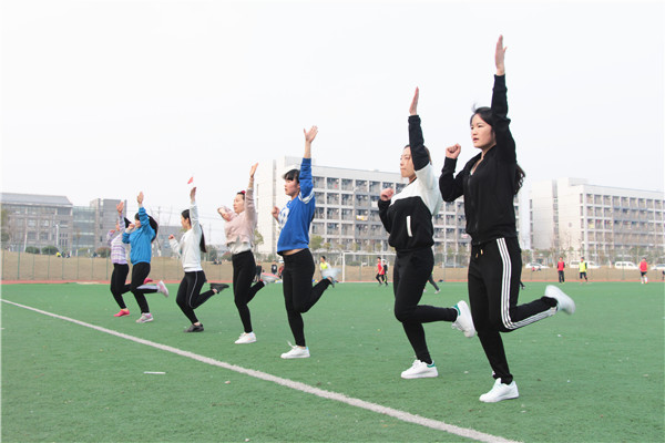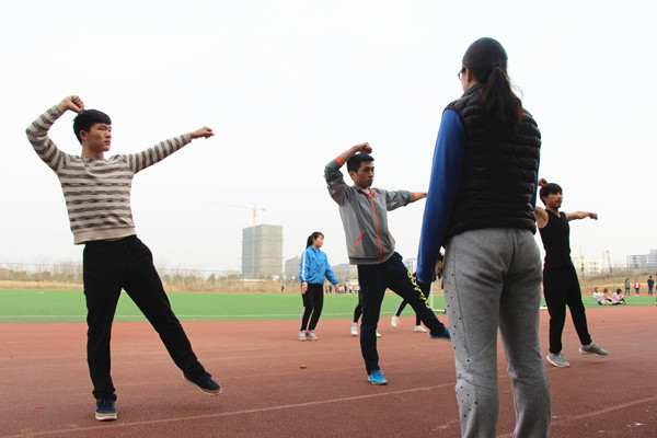 近日,学院的田径场上除了日常锻炼和足球训练的学生们,又多了一群动感的身影,他们是正在刻苦训练的学院健美操队。