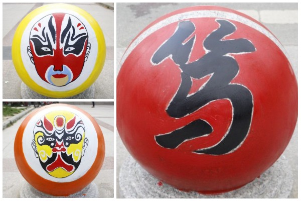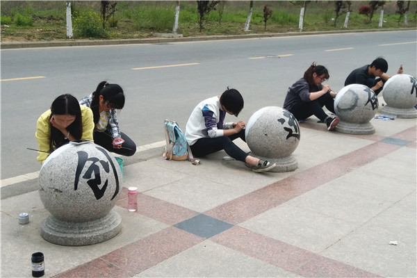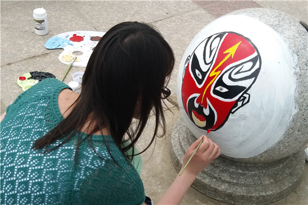 这些平日里不起眼的路障石球,经过学生们的艺术加工,不仅颜色鲜艳好看,而且将民族传统文化与校园文化融为一体,正面是一幅幅多彩戏剧脸谱,背面则书写了“厚学、笃行、奋进、创新”的学院校训。这些色彩斑斓、活泼有趣的校园新景观吸引了不少老师和同学的关注,大家纷纷称赞这个活动有创意,石球上的绘画有魅力。