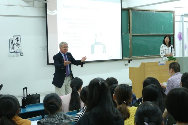 当日,杜靖德(Gene Lamke)教授还为国际商务系旅游(酒店)管理专业的学生们上了一堂关于“电话沟通技巧”的示范课。课上,杜教授风趣幽默的语言,深入浅出的讲授,与学生热烈互动的课堂气氛,都给在场师生留下了深刻的印象,得到一致好评。
