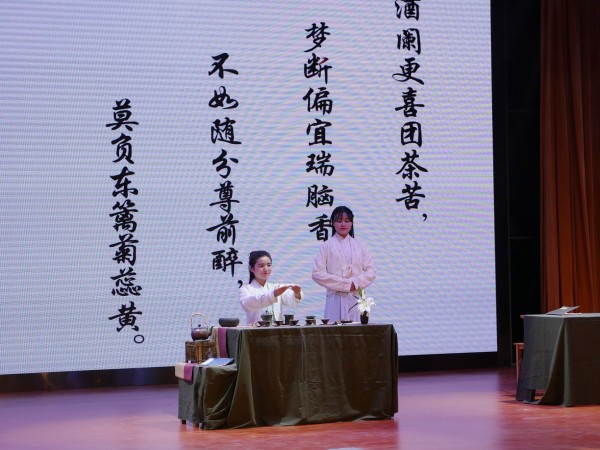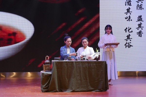 晚会由在安徽省茶文化创新大赛上获得团体第一名的“嘤栖茶社”拉开帷幕,她们带来的《赌书泼茶》茶艺表演,让人领略到了中国茶文化的博大精深,使人赏心悦目、心旷神怡。