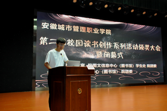 大会第二项是由获得本届校园读书创作征文学生组一等奖的李振作为代表发言,他认为原创征文活动对于当今大学生有着十分重要的意义,能够真正提升同学的文字创作水平,使同学更具独立思想,更善于阅读和思考。