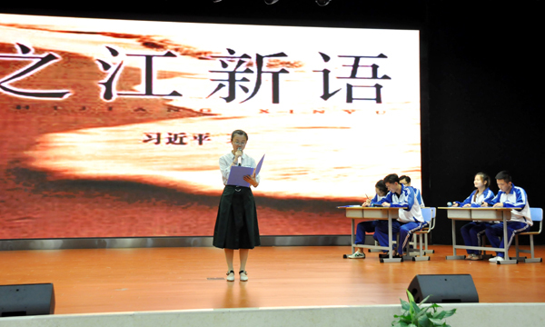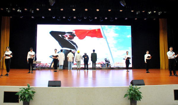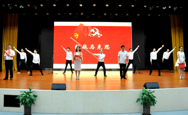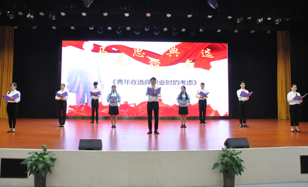 各系部老师与同学们以饱满的热情、斗志昂扬的精神、富有激情的表演,向大家诵读了马克思的《青年在选择职业时的考虑》、《关于费尔巴哈的提纲》,习近平的《之江新语》以及毛泽东的《为人民服务》等经典著作的节选。