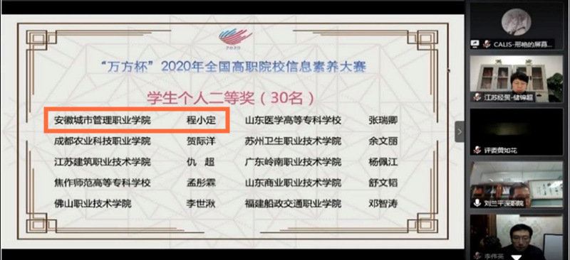 学院高度重视本次赛事,认真筹备,积极应对。10月10日启动信息素养大赛校赛报名,期间学生积极参赛,磨店校区和耕云路校区两校区联动,共计210名同学参与了线上比赛,通过预赛及决赛两个环节决出10名优秀选手,代表学校参加安徽省信息素养大赛省赛。在11月6日的省赛中,程小定、张贺、程开泰同学3名同学荣获二等奖,夏祯昱、范翔羽、何睿婷3名同学荣获三等奖,我校也因成绩突出,获得学生团体赛三等奖的佳绩,其中张贺、程小定两位同学晋级全国信息素养大赛。经过激烈角逐,程小定同学成功入围全国100强总决赛,并最终荣获国赛二等奖。