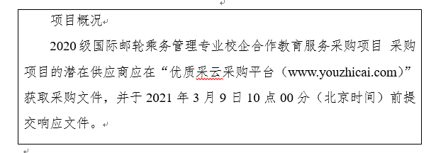 项目名称:2020级国际邮轮乘务管理专业校企合作教育服务采购项目