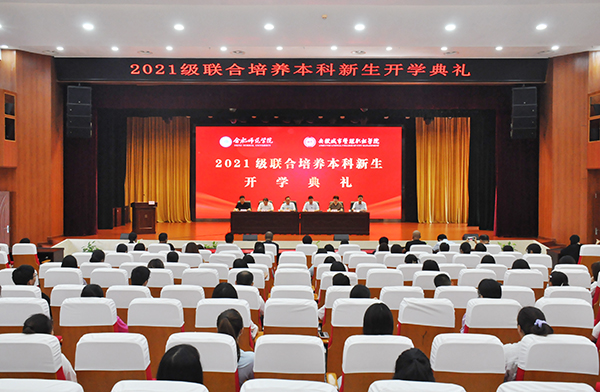 合肥师范学院教务处处长胡昂、我院副院长聂宗瑶以及各部门、二级学院(教学部)负责人等出席典礼,300名2021级联合培养本科新生参加典礼。我院教师和新老生代表分别在开学典礼上发言。(文/党政办公室 图/图文信息中心)