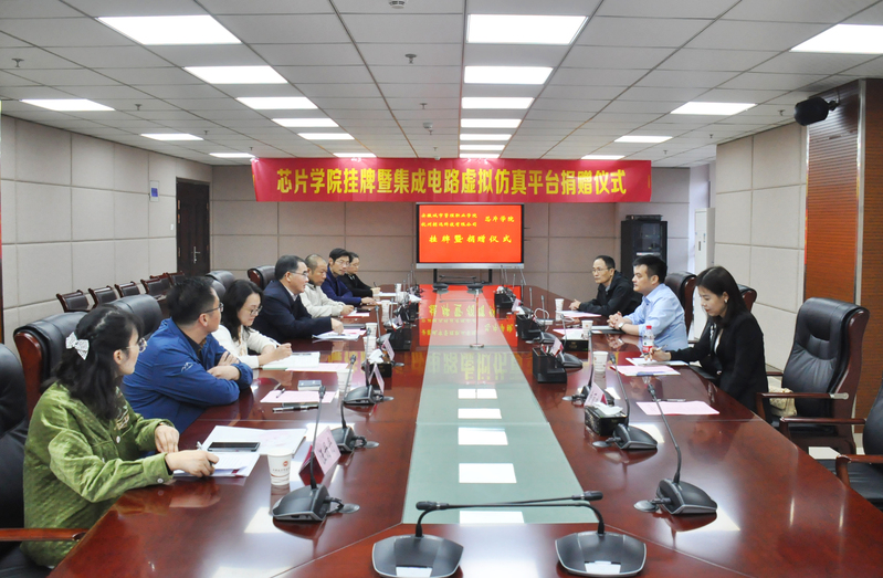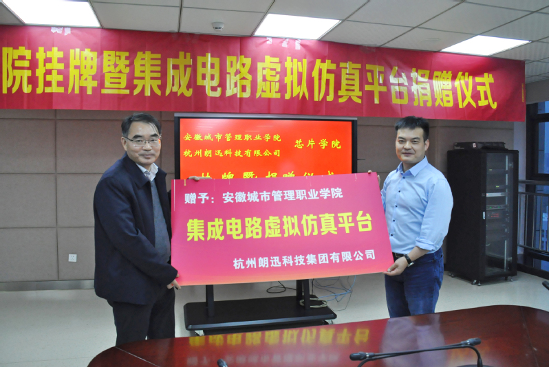 10月26日,我院与杭州朗迅科技集团有限公司举行芯片学院挂牌暨集成电路虚拟仿真平台捐赠仪式。朗迅科技董事长徐振、执行董事兼副总裁黄庆红,我院党委副书记、院长刘瑾,党政办公室、教务处、信息技术学院负责人参加仪式。