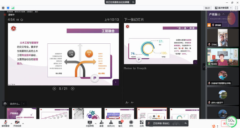 大赛期间,组委会还举办了以“产教融合—新型物业经营管理人才培养”为主题的线上交流研讨会。中国职业经理人协会物业经理人分会李占军、武汉科技大学恒大管理学院副院长童泽平、石家庄学院物业管理系主任张志红、重庆财经学院教研室主任余天霞、山东城市建设职业学院现代物业管理专业负责人杨学英、旭辉永升服务集团有限公司中部区域招聘经理吴轩君、北京现代中欧总经理陈晓军分别进行了报告分享。与会专家立足现阶段,集思广益,共同为新型物业经营管理人才培养贡献智慧与力量。(图文/健康养老学院)
