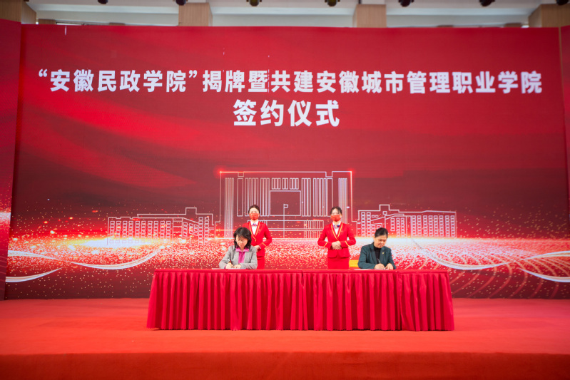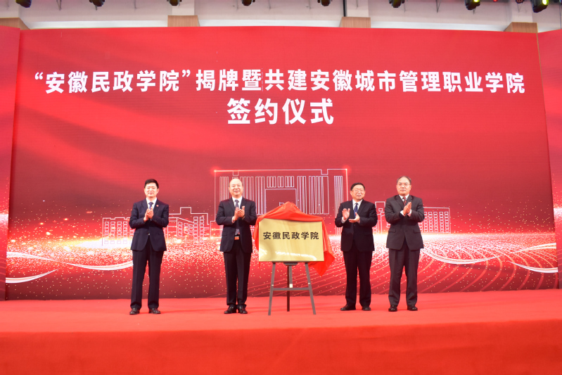 为深入贯彻落实习近平总书记关于教育工作的重要论述以及关于民政工作重要指示精神,积极应对新时代民政事业发展新需求,充分发挥高等院校和行业部门叠加优势,创新和拓宽民政人才培养路径,全力推动安徽民政事业高质量发展,安徽省民政厅与省直机关工委经过共同研究,决定在安徽城市管理职业学院设立“安徽民政学院”。12月22日上午,安徽城市管理职业学院举行“安徽民政学院”揭牌暨共建签约仪式。省直机关工委书记朱斌、省教育厅厅长赵振华、省民政厅厅长张冬云、安徽城市管理职业学院党委书记张明辉为安徽民政学院揭牌。省民政厅副厅长耿学梅、省直机关工委副书记谢兵共同签署合作共建协议。