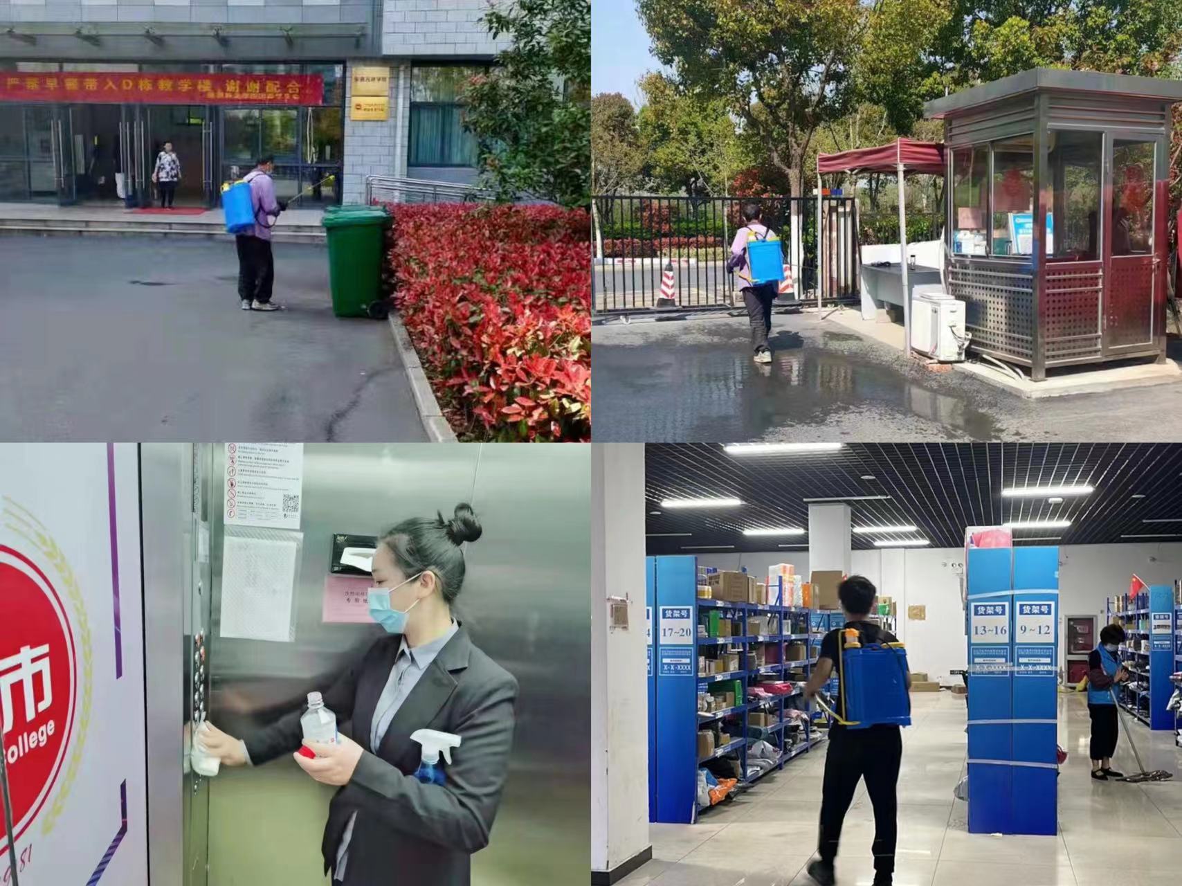 普遍防控、消杀结合。认真做好校园环境消杀工作,严格落实公共区域卫生清洁消毒,重点地方及时消杀。总务处后勤同志率领、安排第三方人员每天定时对两个校区所有公共区域展开“地毯式”消杀,对教室,公寓,食堂、办公室、图书室等公共区域进行消毒通风,对电梯间、楼梯扶手,门把手等与人接触较多区域进行重点消毒,对快递物品、废弃口罩存放垃圾桶、校门口内外处进行重点消杀,对于外运来的学院物资实行随到随卸、随卸随消杀、消杀即转运,确保与外界车辆和人员“零接触”,在门厅、电梯入口处,水池边都配有免洗洗手液、酒精消毒液供师生使用,校园内公共区域的卫生清洁、消毒消杀做到了全时段、全方位、全覆盖,为校园疫情防护筑牢安全屏障。