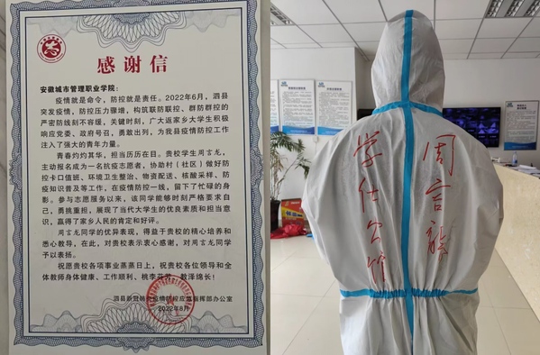 信中指出,周言龙同学积极参加泗县疫情防控工作,在疫情开始之初迅速响应当地号召,主动报名担当志愿者,穿起了白衣铠甲,听从指挥、有序参战,协助村(社区)做好防控关卡口值班、环境卫生整治、物资配送、核酸采样、防疫知识普及等工作,用奉献与爱心筑起疫情防控的防线。在抗疫一线,发挥了新时代青年的光与热,赢得了家乡人民的赞誉。