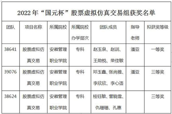 近日,由安徽省教育厅主办、安徽财经大学承办的2022年“国元证券杯”安徽省大学生金融投资创新大赛圆满落幕,来自合肥工业大学、安徽财经大学等省内外76所高校参加了此次比赛。我院财务金融学院教师潘亚所带的队伍在此项赛事中获得一等奖一项、三等奖两项。