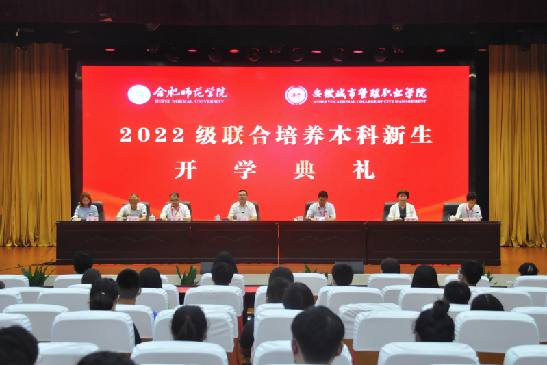 9月15日下午,合肥师范学院与安徽城市管理职业学院联合培养2022级本科新生开学典礼隆重举行。合肥师范学院党委书记徐成钢、安徽城市管理职业学院党委书记张明辉出席开学典礼并讲话,安徽城市管理职业学院院长刘瑾主持典礼。合肥师范学院教务处处长胡昂、安徽城市管理职业学院纪委书记秦少锋、副院长聂宗瑶以及各部门、二级学院(教学部)负责人等出席典礼。