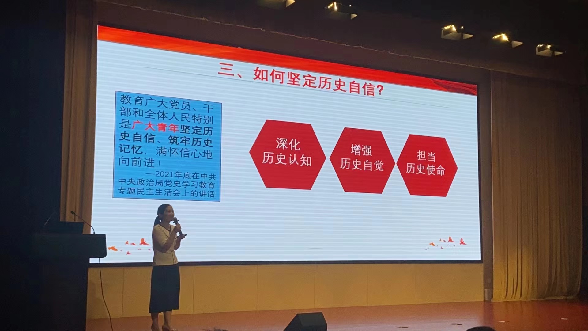 刘玲以《坚定历史自信走好新的赶考之路》为题,围绕“什么是历史自信”、“我们的历史自信从哪里来”以及“应该如何坚定历史自信”三个方面展开讲述,阐明历史自信的内涵、源泉以及进一步教育广大青年坚定历史自信的思考。