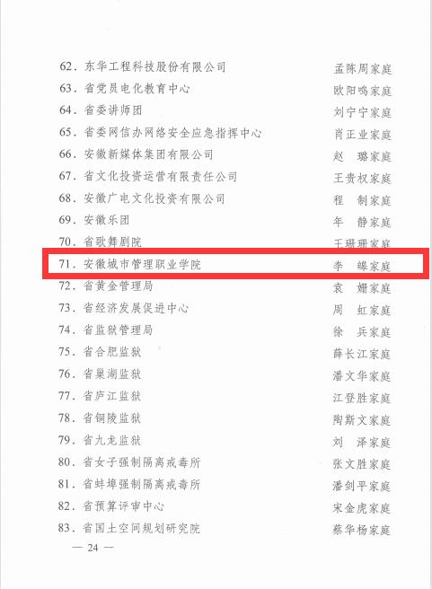 近日,安徽省直属机关精神文明建设活动委员会公布了“2020-2022年度省直机关文明家庭”名单,其中,我院党政办公室李皞同志的家庭光荣上榜,获得“省直机关文明家庭”荣誉称号。