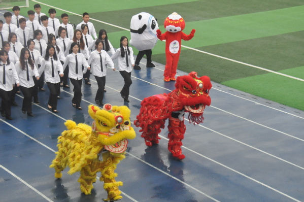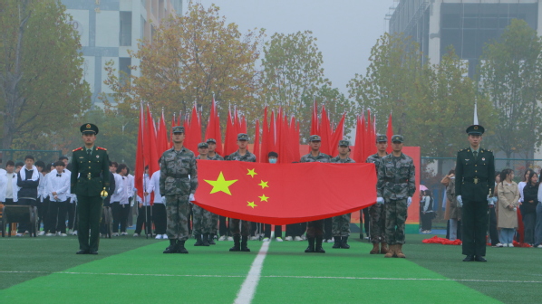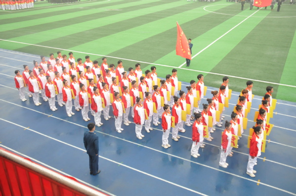 伴随着激昂的运动员进行曲,校国旗护卫队护卫着鲜艳的五星红旗和校旗步入会场,开幕式正式开始。