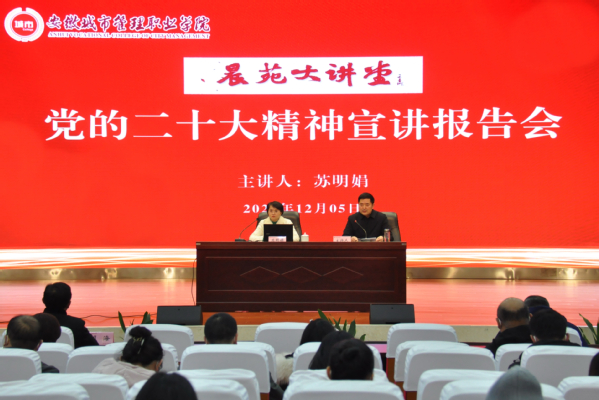 为进一步学习宣传贯彻党的二十大精神,引导学院广大师生把思想统一到党的二十大精神上来,根据省直机关工委统一部署和安排,12月5日下午,党的二十大代表、中国工商银行安徽省分行人力资源部总经理助理、团省委兼职副书记、希望工程的“大眼睛”苏明娟同志应邀来学院面向师生深入宣讲党的二十大精神。学院党委书记张明辉主持报告会,工委机关党委专职副书记胡海出席报告会,学院领导班子成员、党员教职工、思政课教师、辅导员和学生代表近300人参加报告会。