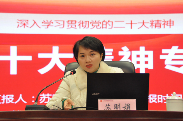 报告会上,苏明娟分享了亲历党的二十大盛会的感受和体会,并结合自己的成长经历和工作实际,宣讲党的二十大精神。苏明娟在宣讲中表示,党的二十大精神内容十分丰富,要牢牢把握核心要义,学深悟透笃行党的二十大精神。习近平总书记在党的二十大报告中指出,要办好人民满意的教育,完善覆盖全学段学生资助体系,促进教育公平,培养德智体美劳全面发展的社会主义接班人。她表示,作为新时代公益事业的受益者,希望和青年大学生一起,深入学习宣传贯彻好党的二十大精神,深刻领悟“两个确立”的决定性意义,坚定不移在思想上政治上行动上同以习近平同志为核心的党中央保持高度一致,坚决听党话、感党恩、跟党走,为党的事业不懈努力和奋斗,传承希望薪火。