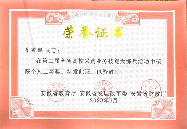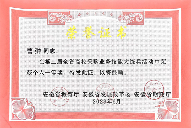6月26日,第二届安徽省高校采购业务技能大练兵活动决赛在安徽艺术学院戏剧楼小剧场落下帷幕,全省71所高校(高职高专组39所)200多名从业人员参加竞赛。学院国有资产管理处(招标采购办公室)处长纪启国担任领队,曹翀和李帅鹏两位老师代表学院参赛,获高职高专组团体一等奖。
