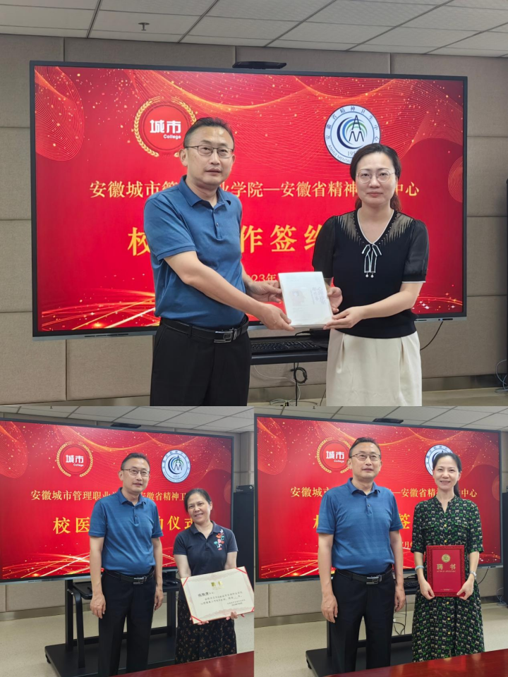为贯彻落实教育部等十七部门联合印发《全面加强和改进新时代学生心理健康工作专项行动计划(2023—2025年)》和省委、省政府关于学院安全和学生心理健康工作的部署等文件精神,防范学生心理危机,畅通学生就诊渠道,7月6日,学院与安徽省精神卫生中心(合肥市第四人民医院)签订了校医合作协议,并开展《常见精神心理问题识别与应对》专题讲座。我院党委副书记孙建华,合肥市第四人民医院党委委员、副院长罗蓓蓓出席签约仪式并讲话。学生处负责人、心理健康教育与咨询中心部分老师参加仪式。