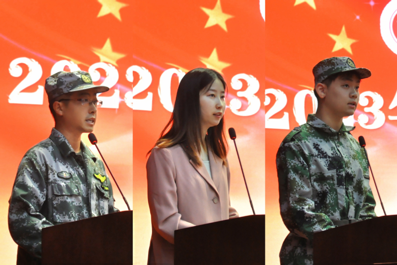 会上,军训教官朱鹏飞、学前教育学院辅导员张晓宇、信息技术学院2023级数字媒体技术2班武海俊分别代表承训教官、新生辅导员和全体新生做表态发言。