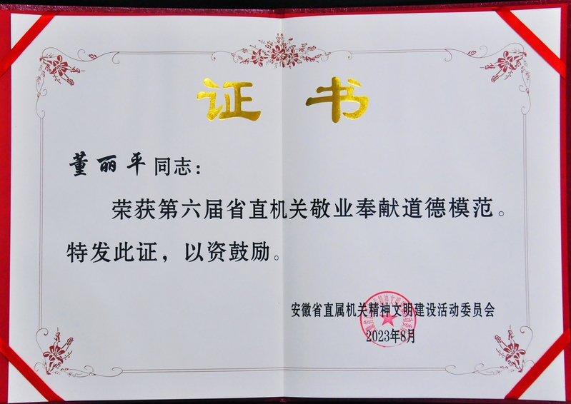 为充分展示省直机关思想道德建设成果,激发广大干部职工奋进新征程、建功新时代的信心决心,今年5月起,省直文明委组织开展了第六届省直机关道德模范评选表彰活动。按照从严把关,优中选优原则,我院教师董丽平荣获省直文明委授予的“敬业奉献道德模范”荣誉称号。