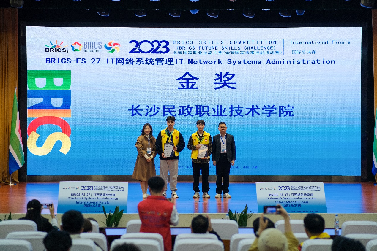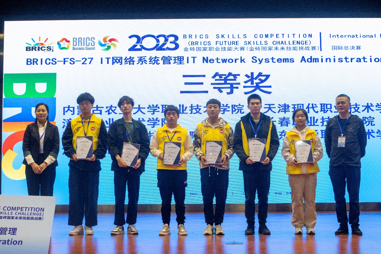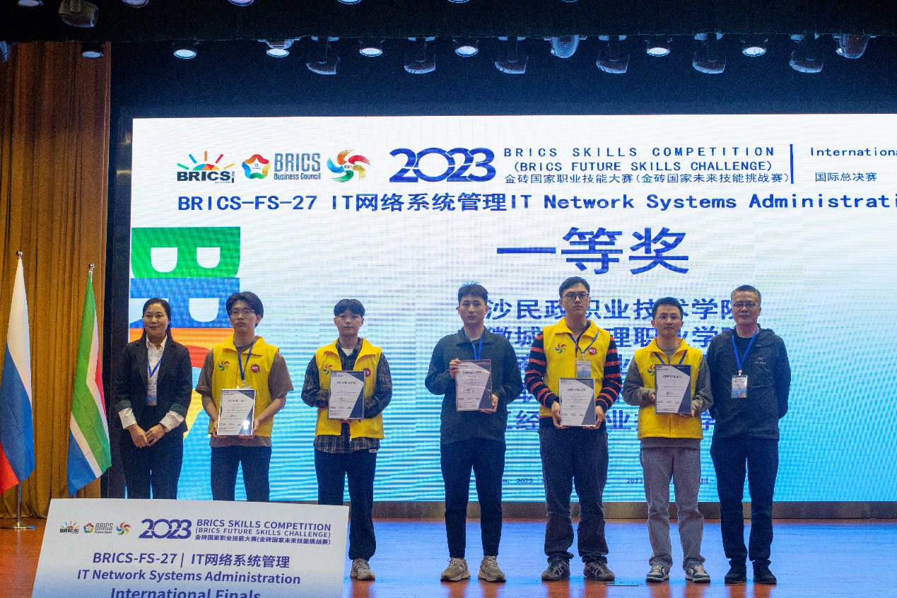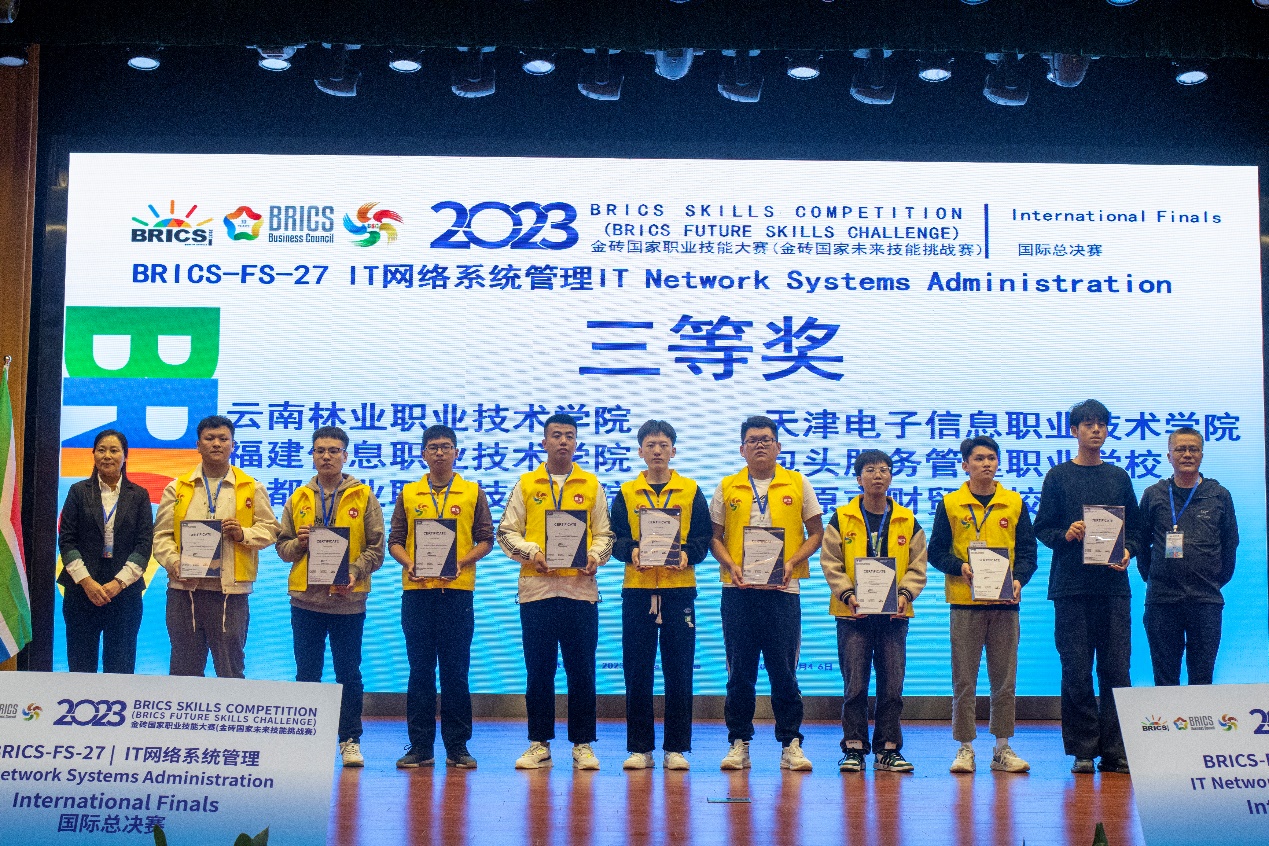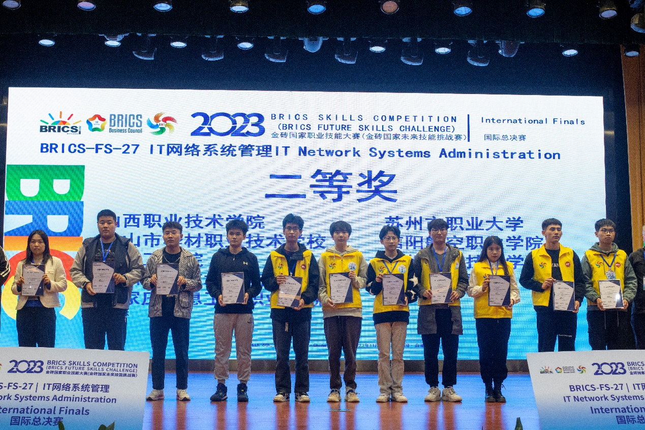 据悉,金砖国家职业技能大赛是金砖国家职业技能领域的盛会,也是技能人才的展示舞台。本次举办的IT网络系统管理赛项国际总决赛是一项双人技能竞赛,由两位选手合力完成赛项内容,大赛经过两天的激烈角逐,最终产生一等奖5个、二等奖9个、三等奖14个。