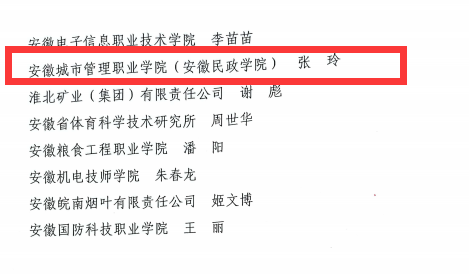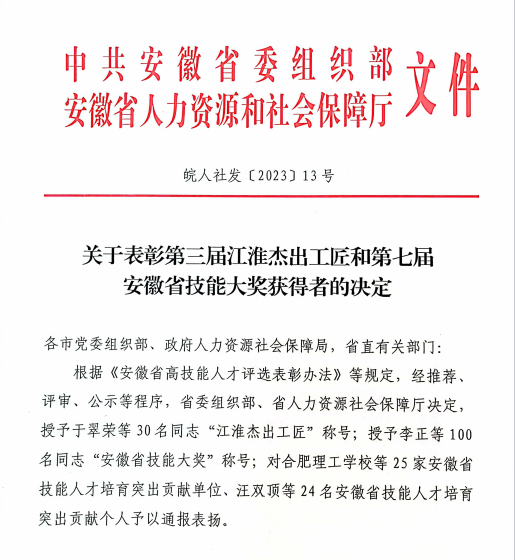 近日,中共安徽省委组织部、安徽省人力资源和社会保障厅联合发布了《关于表彰第三届江淮杰出工匠和第七届安徽省技能大奖获得者的决定》,我院教师张玲获得“安徽省技能人才培育突出贡献个人”荣誉称号。