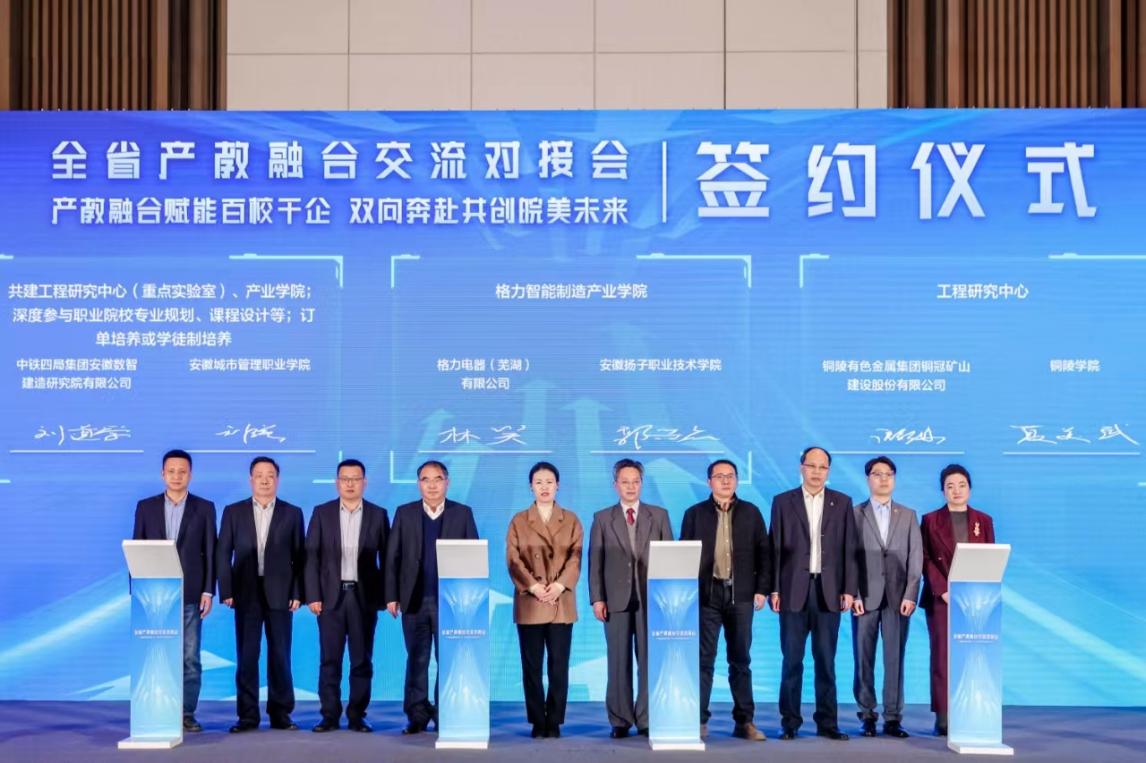 会上,省发改委、省经信厅、省科技厅、省国资委等相关职能部门领导宣讲了安徽省智能家电(居)、人工智能、新能源汽车、新材料等行业的产业政策,合肥市、芜湖市、合肥学院、科大讯飞股份有限公司等分享了产教融合经验,会议发布了安徽省第五批产教融合型企业建设培育名单、有合作意向的职业院校和企业名单以及安徽省产教融合典型案例。对接会现场,十多家省内外知名企业与院校签约合作,刘瑾代表学院与中铁四局集团安徽数智建造研究院有限公司签署产教融合协议。(图文/产教融合办公室)