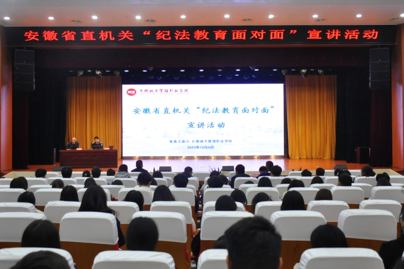 为加强省直所属大中专院校法治建设,提高广大师生法治素养,12月6日,由省直机关工委主办、安徽城市管理职业学院承办的省直机关“纪法教育面对面”活动在学院新站校区报告厅开讲。活动邀请省直“八五”普法宣讲团成员为师生宣讲。教师、辅导员和学生代表300余人参加,党委委员、纪委书记秦少锋主持宣讲。