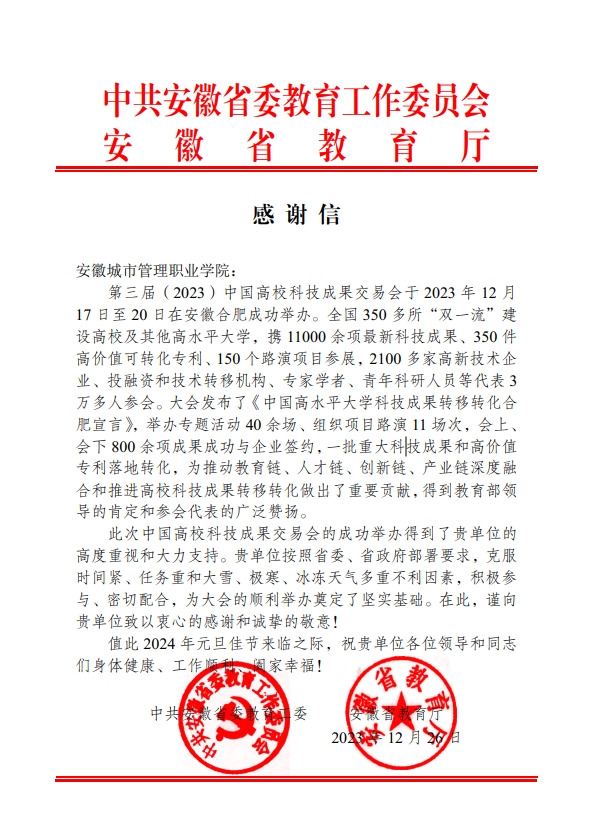 12月17日至20日,第三届(2023)中国高校科技成果交易会在合肥成功举办。会议期间,我院积极按照省委、省政府部署要求,克服时间紧、任务重和大雪、极寒、冰冻天气等多重不利因素,统筹协调、密切配合,顺利完成会议服务保障工作。活动结束后,省教育工委和教育厅发来感谢信,对我院的工作成果予以充分肯定,并表示感谢。