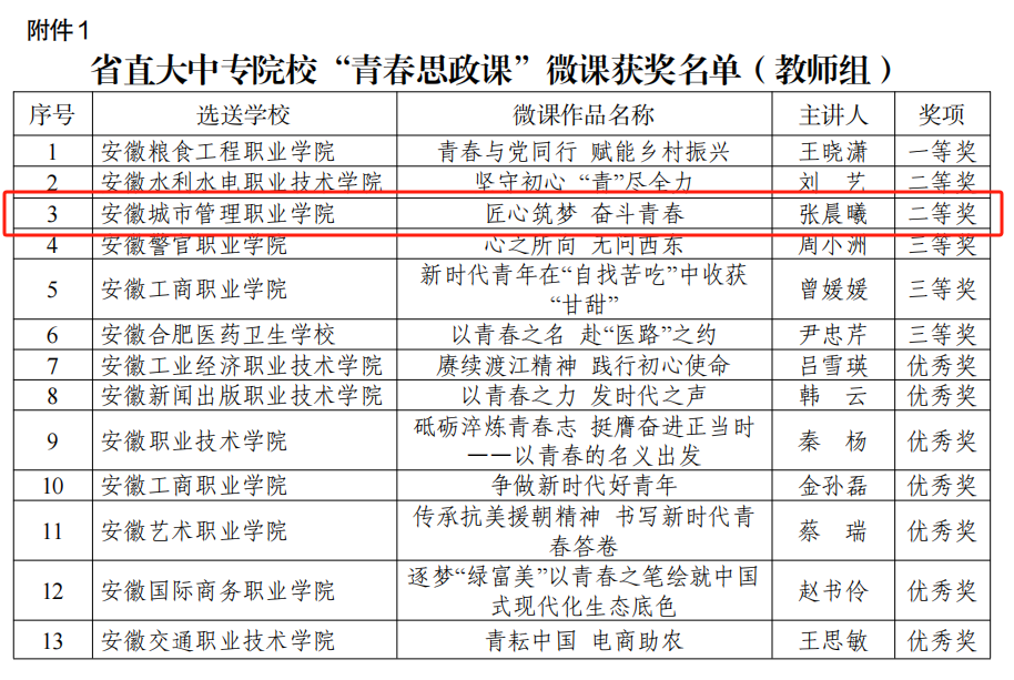 近日,由省直机关团工委组织开展的省直大中专院校“青春思政课”微课优秀作品征集评选活动结果揭晓。学院张晨曦老师作品《匠心筑梦 奋斗青春》获教师组二等奖。