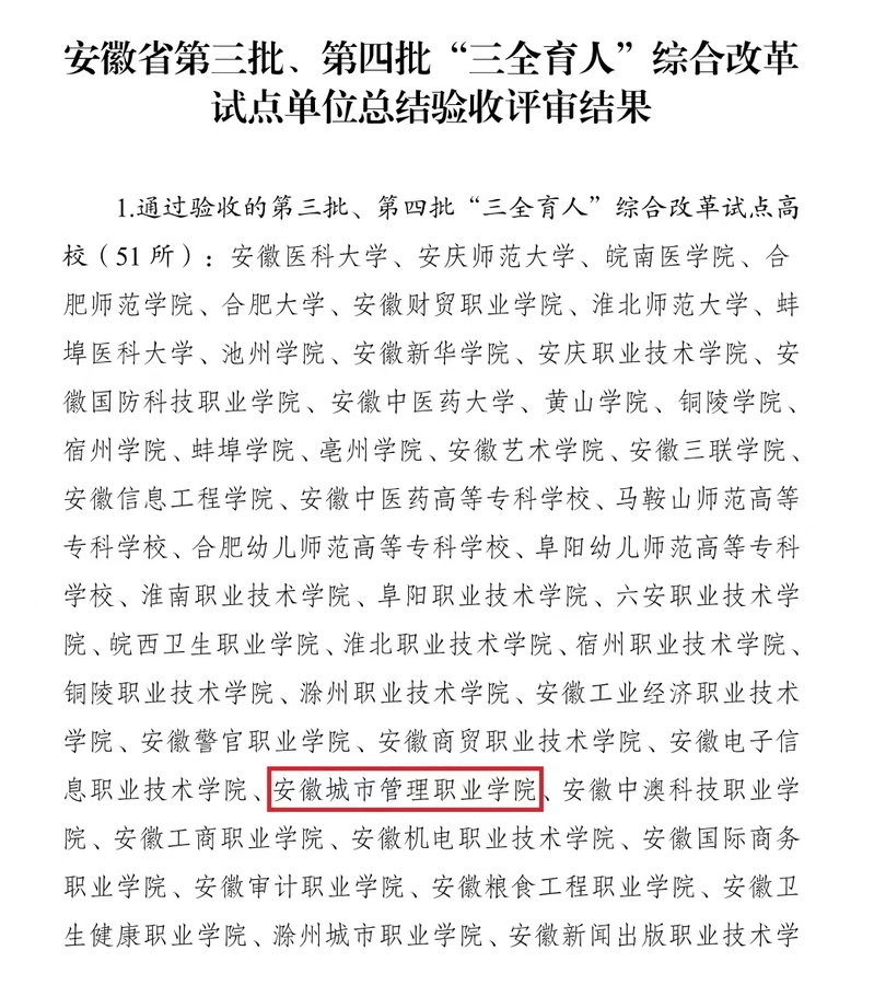 自2021年获批安徽省第四批“三全育人”综合改革试点高校以来,学院坚持以习近平新时代中国特色社会主义思想为指导,紧紧围绕立德树人根本任务,积极构建全员、全过程、全方位育人格局,围绕建设“双高校”办学目标,深入推进新时代“三全育人”综合改革新体系、新思路、新方法。通过“三聚焦”完善工作机制和体系,党建引领、思政赋能、专业特色育人,打造“政社校企家”五协同工作机制,深入推进“十大育人体系提升工程”,“三全育人”综合改革取得喜人成绩。学院荣获安徽省党建工作示范校、全国首批健康学校建设单位、“安徽省高水平学校和专业群”建设单位,安徽省首批“三教”改革示范校等。