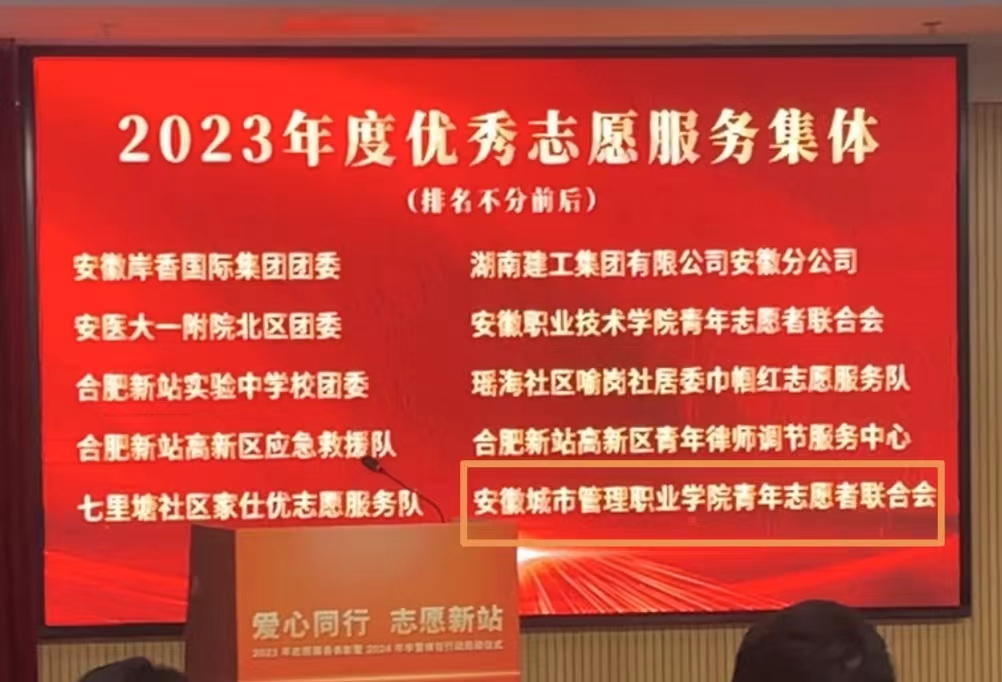 3月5日上午,由合肥新站高新区团工委组织的“2023年志愿服务表彰暨2024年学雷锋在行动启动仪式”成功举办,学院青年志愿者联合会荣获“2023年度新站高新区志愿服务先进集体”荣誉称号,十家获奖单位中只有两所高校单位获此殊荣。我院郝祥银、张庆盼、杨安琪三名同学荣获2023年度合肥新站高新区“优秀志愿者”称号。