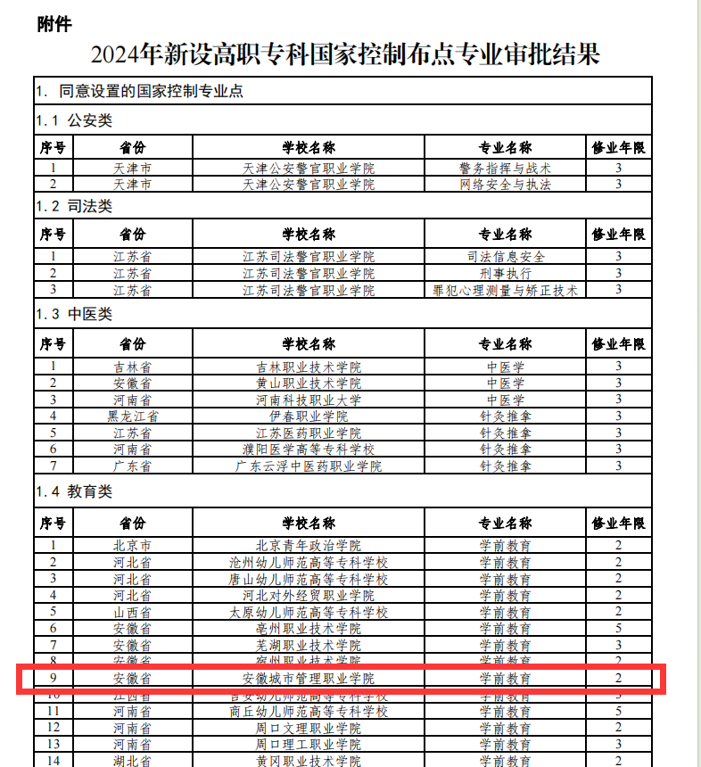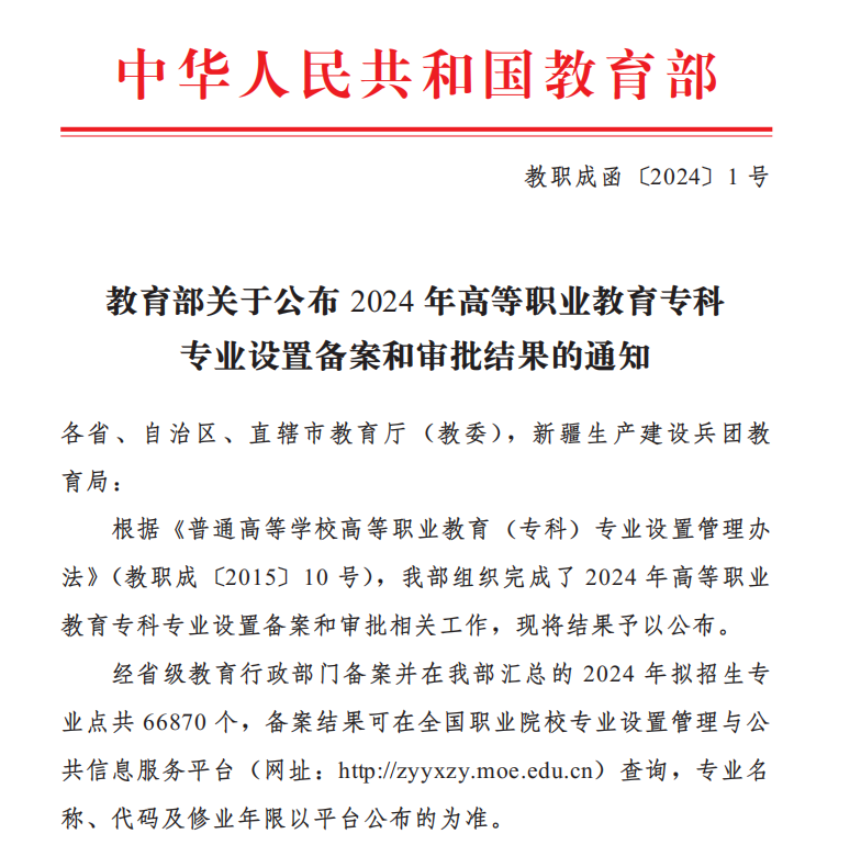 近日,教育部公布了2024年高等职业教育专科专业设置备案和审批结果。我院申报的高职专科国控专业学前教育(两年制)专业布点成功获批;此外,护理(两年制)专业也成功获批2024年招生专业布点,这两个专业将于今年正式招生。