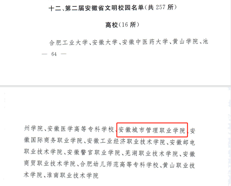 近日,根据《关于命名表彰安徽省文明城市(城区)、文明村镇、文明单位、文明家庭、文明校园的通报》(皖宣组字〔2024〕2号),安徽城市管理职业学院荣获第二届安徽省文明校园荣誉称号。