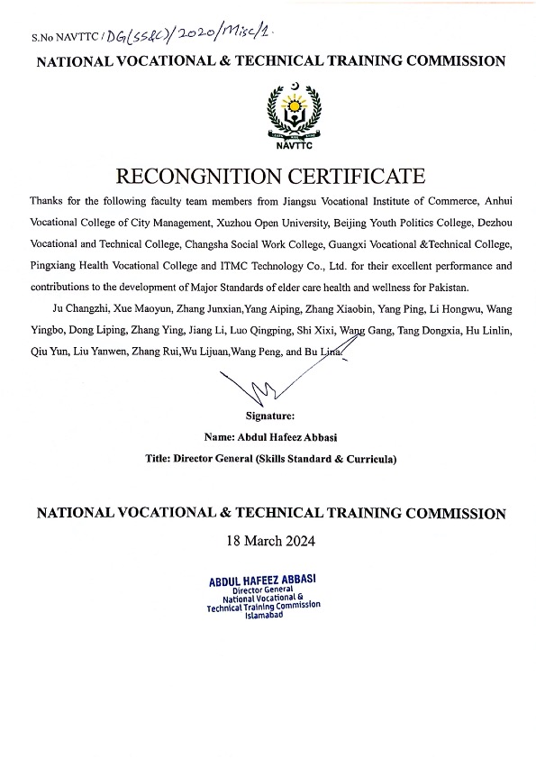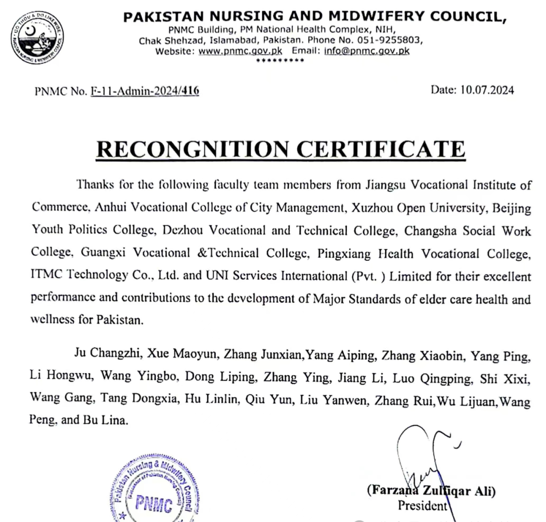 近日,我院参与制定的《巴基斯坦老年照护专业标准》,获得巴基斯坦国家职业与技术培训委员会以及巴基斯坦卫生部助产与护理委员会的权威认证。