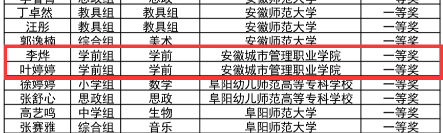 10月25日至27日,安徽省高等学校师范生教学技能竞赛暨第六届长三角师范生教学基本功大赛选拔赛在淮南师范学院成功举办。我院23级学生李烨(指导老师:冯琛琛、陈晓菁、吴大尉)、叶婷婷(指导老师:胡佳缘、方子馨、刘小雨)凭借卓越的表现,荣获师范生技能竞赛(学前组)一等奖2项,展现了学前教育学院学子的非凡实力与风采。