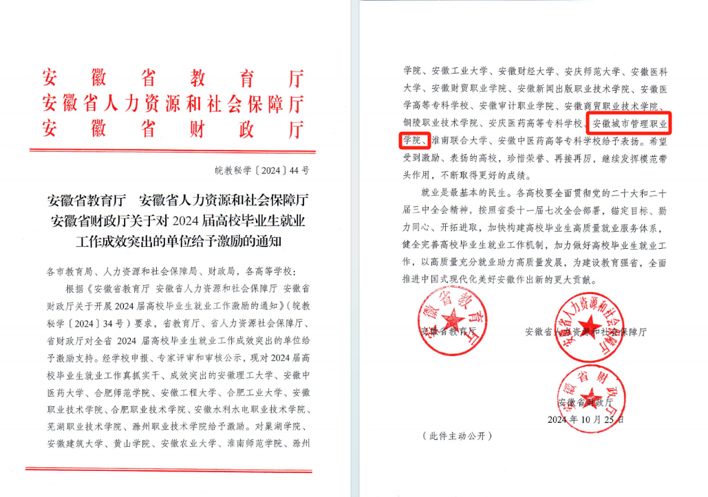 会上宣读了《安徽省教育厅、安徽省人力资源和社会保障厅、安徽省财政厅关于对2024届高校毕业生就业工作成效突出的单位给予激励的通知》,对2024年度普通高校毕业生就业工作成效突出单位(本科、高职院校各5所)给予激励,并对20所高校给予表扬(本科、高职院校各10所)。我院因2024届高校毕业生就业工作成效突出,获得表扬。