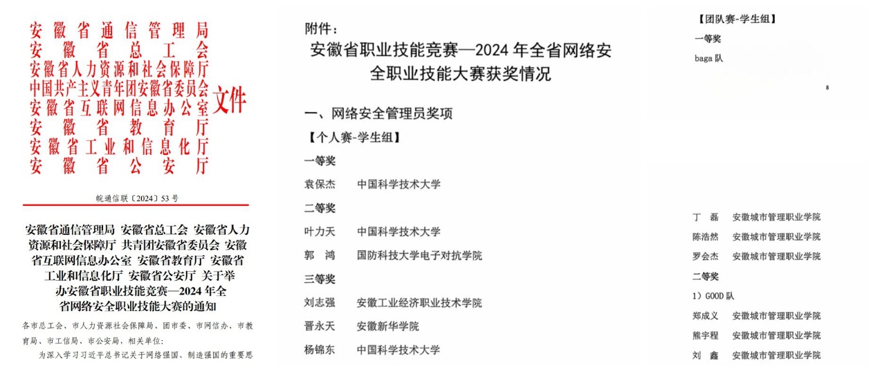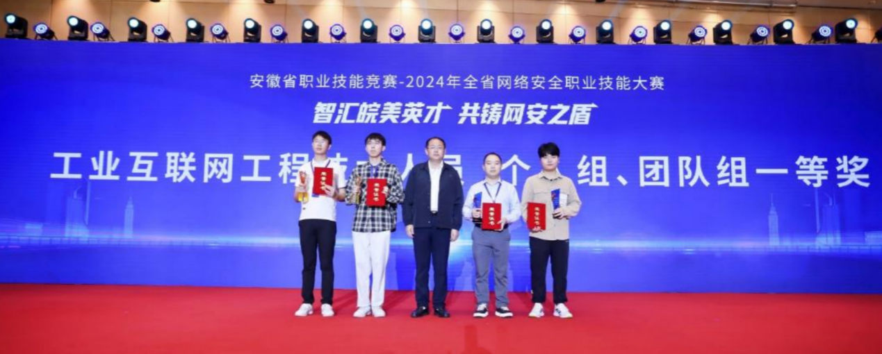10月13日至16日,由安徽省通信管理局、安徽省总工会、安徽省人力资源和社会保障厅、共青团安徽省委员会、安徽省互联网信息办公室、安徽省教育厅、安徽省工业和信息化厅、安徽省公安厅八部门联合主办的安徽省职业技能竞赛—2024年全省网络安全职业技能大赛在合肥举行。我院学子在工业互联网工程技术人员赛道学生组团体赛中分别荣获一等奖第一名、二等奖第一名,并代表安徽省进入国赛争夺。这是我院首次在此类比赛中取得突破。