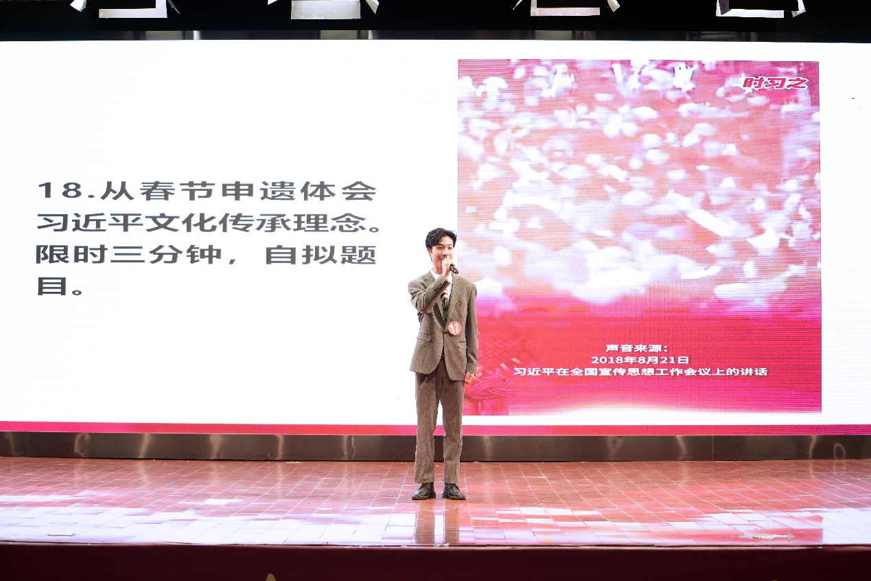 比赛分为复赛和决赛两个阶段,复赛采取主题演讲的线上评审方式,共有19人进入决赛。决赛采取即兴演讲的现场评审方式。比赛中,我院学子以“中国时刻”为题,阐述春节申遗成功的重要意义,语言流畅、逻辑清晰,赢得了现场观众的阵阵掌声。