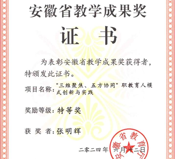 2024年,由党委书记张明辉主持的《“三维聚焦 五方协同”职教育人模式创新与实践》获安徽省级质量工程教学成果奖项目特等奖,这是继2022年后学院再次获得该项目特等奖。同时,另有4个项目获一等奖1项、二等奖3项。