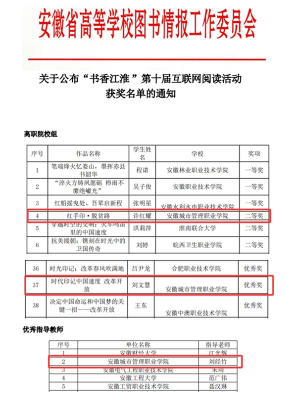 近日,由安徽省高等学校图书情报工作委员会主办的“书香江淮”第十届互联网阅读活动圆满落幕。我院师生取得了优异成绩,其中,许红耀同学凭借其作品《红手印·脱贫路》荣获高职院校组二等奖,马平静同学的《大国脊梁,南山巍峨》荣获高职院校组三等奖,刘文慧同学的《时代印记中国速度 改革开放》荣获优秀奖,刘经竹老师获优秀指导教师称号。