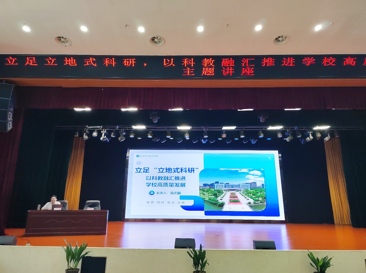 为深化科研内涵建设,推动学院高质量发展,7月3日上午,学院举办“立足‘立地式科研’以科教融汇推进学校高质量发展”专题讲座,芜湖职业技术大学科研处处长吴庆国教授担任主讲。学院党委书记晏祥,党委委员、副院长聂宗瑶出席,讲座由党委委员、副院长张昊主持,学院骨干教师代表参加学习。