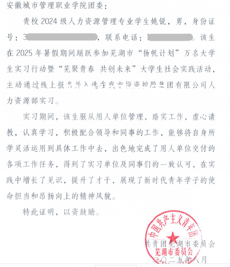 近日,我院收到共青团芜湖市委员会发来的表扬信,对本科部2024级人力资源管理专业学生姚锐,在“扬帆计划”实习实践活动中的出色表现给予高度认可与赞扬。