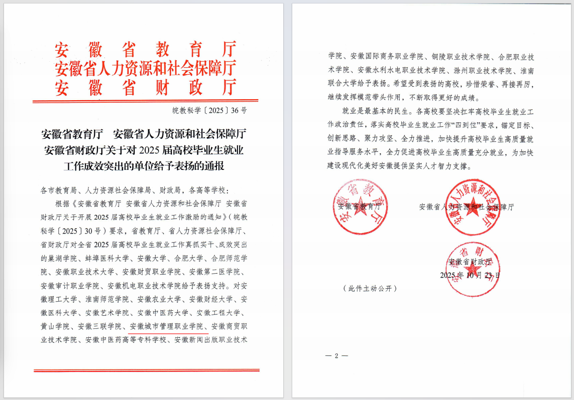 会上宣读了《安徽省教育厅、安徽省人力资源和社会保障厅、安徽省财政厅关于对2025届高校毕业生就业工作成效突出的单位给予表扬的通报》,学院凭借扎实的就业工作体系和显著的育人成果,获得全省通报表扬。