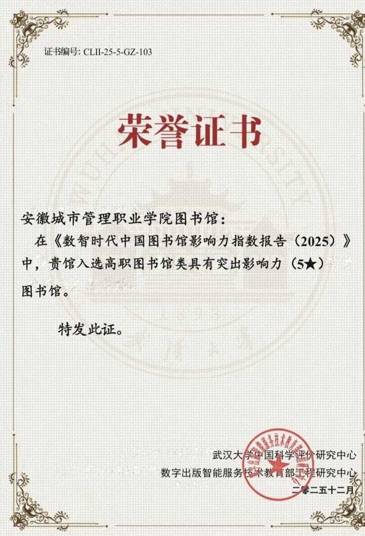 近日,武汉大学中国科学评价研究中心等权威机构联合发布《数智时代中国图书馆影响力指数报告(2025)》。学院图书馆凭借扎实的综合实力与突出的服务效能,成功获评高职高专图书馆类“五星图书馆”,在全国1554所高职高专院校图书馆中位列第103名,居安徽省内第5位。